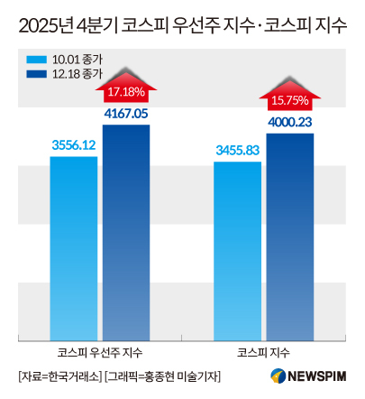 18일 한국거래소에 따르면 상법 개정 논의가 본격화된 올 4분기(10월 1일~12월 18일) 코스피 우선주 지수는 17.18% 상승해 같은 기간 15.75% 오른 코스피 지수 상승률을 웃돌았다. 우선주 투자 수요가 지수 흐름에 반영되며 보통주 대비 초과 수익을 기록한 셈이다.