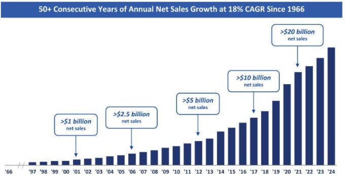 매출액 증가율은 튼튼하면서도 안정적이다. 1966년 창업 이후 현재까지의 연간 매출액 연평균 성장률은 18%, 최근 10년 동안은 약 14%다. 또 2008년 금융위기 당시에는 되레 17% 늘었고 2020~2022년 코로나19 사태 때에는 연평균 11% 증가했다. 올해 3분기까지 9개월 동안의 매출액 증가율(y/y)은 10%다. 작년 연간 역시 10%다.