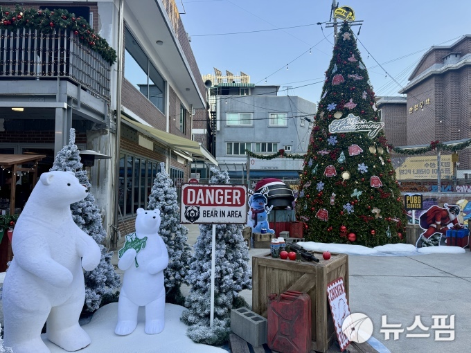 이날 오후 방문한 펍지 성수는 대형 트리와 크리스마스 장식, 야외 난로가 펍지 세계관과 만나 연말 분위기를 자아냈다. 배틀그라운드를 상징하는 헬멧과 헬멧을 쓴 남성 캐릭터는 산타 모자를 착용하고 있었고 펍지 카페 입구에서는 겨울 먹거리 '황금삼뚝빵'을 만나볼 수 있다.