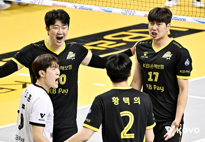 [서울=뉴스핌] KB 선수들이 18일에 열린 삼성화재와의 경기에서 공격에 성공한 후 환호하고 있다. [사진 = KOVO] 2025.12.18 wcn05002@newspim.com