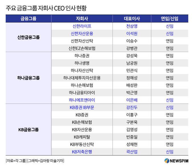 가장 먼저 인사를 단행한 신한금융은 4곳 중 신한라이프(천상영)와 신한자산운용(이석원) 등 2명을 교체했다. 하나금융은 7곳 중 하나에프앤아이(이은배) 1명을, KB금융은 6개 자회사 7명(부문대표 포함) 중 KB증권 IB부문(강진두)과 KB저축은행(곽산업) 등 2명을 각각 교체했다.