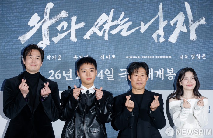 [서울=뉴스핌] 류기찬 기자 = 배우 유지태(왼쪽부터), 박지훈, 유해진, 전미도가 19일 오전 서울 용산구 CGV 용산아이파크몰에서 열린 ‘왕과 사는 남자 제작보고회’에서 포즈를 취하고 있다. 영화 '왕과 사는 남자'는 1457년 청령포, 마을의 부흥을 위해 유배지를 자처한 촌장과 왕위에서 쫓겨나 유배된 어린 선왕의 이야기다. 내년 2월 개봉. 2025.12.19 ryuchan0925@newspim.com