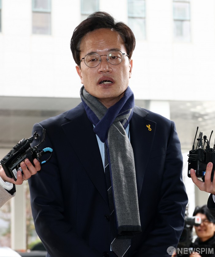 [서울=뉴스핌] 최지환 기자 = 박주민 더불어민주당 의원이 19일 오후 서울 양천구 서울남부지방법원에서 열린 패스트트랙 충돌 사건 선고기일에 출석하며 취재진 질문에 답변하고 있다. 2025.12.19 choipix16@newspim.com