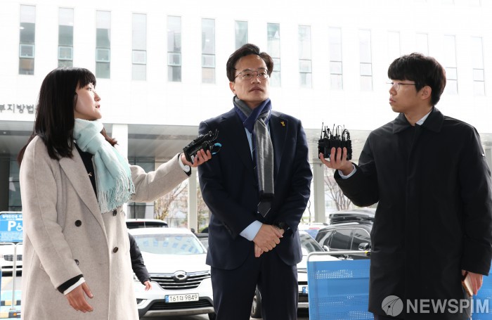 [서울=뉴스핌] 최지환 기자 = 박주민 더불어민주당 의원이 19일 오후 서울 양천구 서울남부지방법원에서 열린 패스트트랙 충돌 사건 선고기일에 출석하며 취재진 질문에 답변하고 있다. 2025.12.19 choipix16@newspim.com