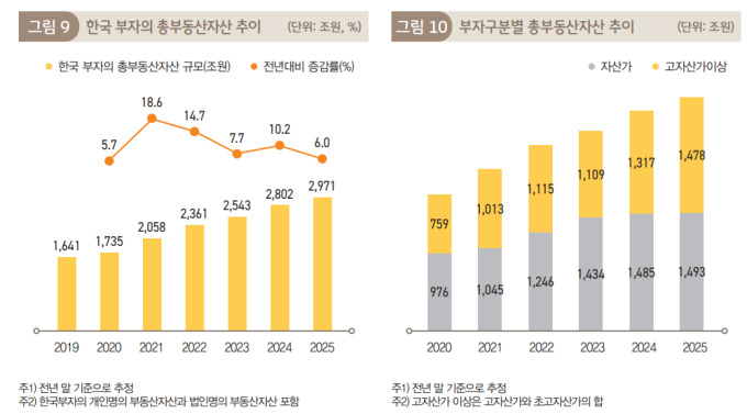 5년 뒤인 2025년에는 자산가의 보유 자산이 1493조원으로 늘어 전체의 50.3%를 차지했고, 고자산가 이상은 1478조원으로 49.7% 수준까지 상승했다. 자산가의 부동산 자산이 2020년 이후 연평균 8.9% 증가한 데 비해 고자산가 이상의 증가율은 14.3%로 크게 앞섰다.
