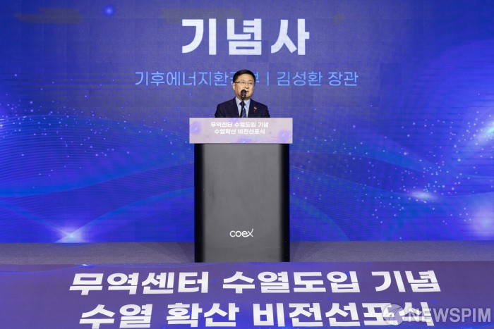 [서울=뉴스핌] 김성환 기후에너지환경부 장관이 19일 서울 강남구 한국무역센터에서 열린 수열에너지 확산을 위한 비전 선포식에서 기념사를 하고 있다. [사진=기후에너지환경부] 2025.12.19 photo@newspim.com