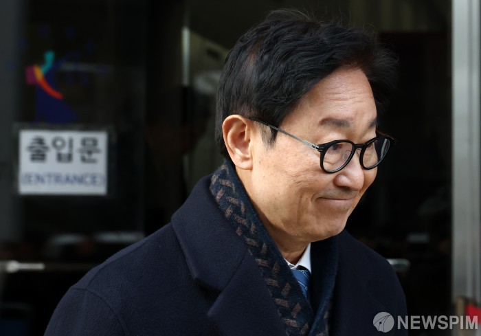 [서울=뉴스핌] 최지환 기자 = 박범계 더불어민주당 의원이 19일 오후 서울 양천구 서울남부지방법원에서 열린 패스트트랙 충돌 사건 선고기일에서 벌금 300만원 선고유예를 받은 뒤 법정을 나서고 있다. 2025.12.19 choipix16@newspim.com