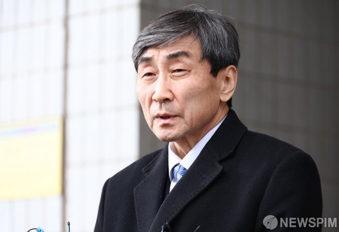 [서울=뉴스핌] 최지환 기자 = 이종걸 전 더불어민주당 의원이 19일 오후 서울 양천구 서울남부지방법원에서 열린 패스트트랙 충돌 사건 선고기일에서 벌금 500만원을 선고받은 뒤 입장을 밝히고 있다. 2025.12.19 choipix16@newspim.com