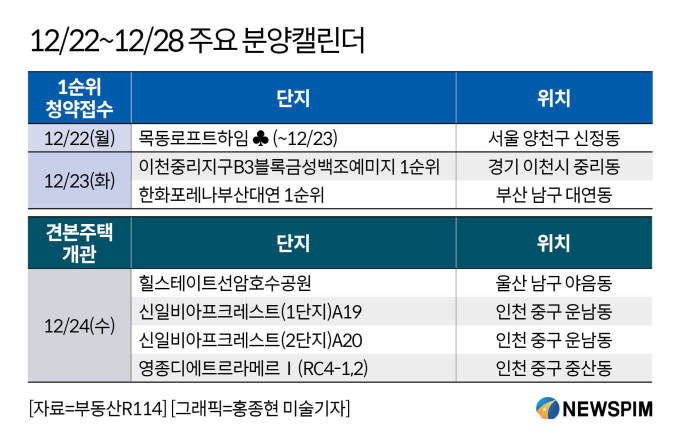[서울=뉴스핌] 송현도 기자 = 20일 부동산R114에 따르면 12월 넷째 주에는 전국 3개 단지 총 1406가구(일반분양 1143가구)가 분양을 시작한다. 경기 이천시 중리동 '이천중리지구B3블록금성백조예미지', 부산 남구 대연동 '한화포레나부산대연' 등에서 청약을 진행한다.