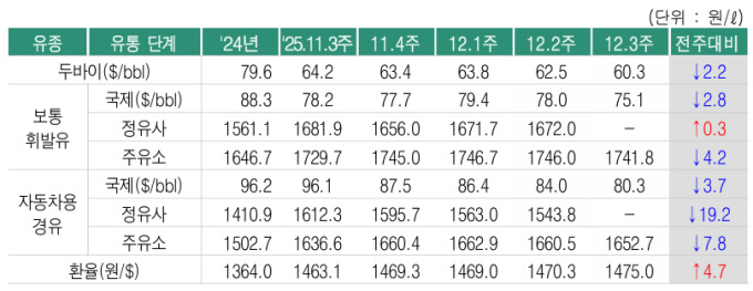 지난주(12월 2주) 정유사 휘발유 공급가격은 전주보다 0.3원 상승한 리터당 1672.0원, 경유 공급가격은 19.2원 하락한 리터당 1543.8원으로 집계됐다.