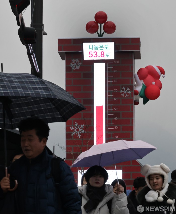 [서울=뉴스핌] 양윤모 기자 = 2025년도 저물어가는 20일 서울 종로구 광화문광장에 설치된 사랑의 온도탑 나눔 온도가 53.8도를 나타내고 있다. 2025.12.19 yym58@newspim.com