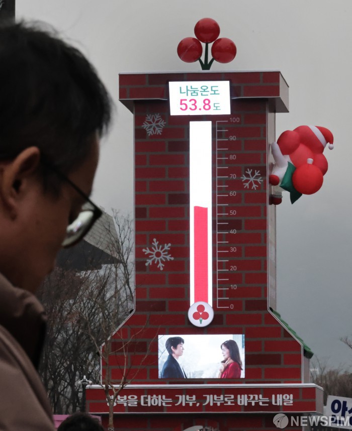 [서울=뉴스핌] 양윤모 기자 = 2025년도 저물어가는 20일 서울 종로구 광화문광장에 설치된 사랑의 온도탑 나눔 온도가 53.8도를 나타내고 있다. 2025.12.19 yym58@newspim.com