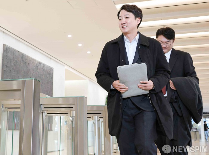 [서울=뉴스핌] 윤창빈 기자 = 이준석 개혁신당 대표가 윤석열 전 대통령의 공천개입 의혹과 관련한 조사를 받기 위해 21일 서울 종로구 KT광화문빌딩 웨스트에 마련된 민중기 특별검사팀에 출석하고 있다. 2025.12.21 pangbin@newspim.com