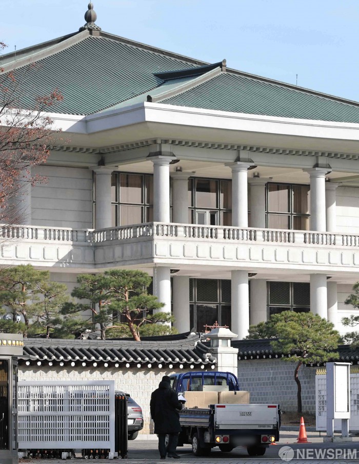 [서울=뉴스핌] 윤창빈 기자 = 21일 서울 종로구 청와대 시화문으로 화물차량이 들어서고 있다. 3년7개월만에 용신에서 청와대로 이전한 대통령실 집무실은 올해 말까지 이사를 마무리해 내년부터 본격 업무에 돌입할 예정이다. 2025.12.21 pangbin@newspim.com