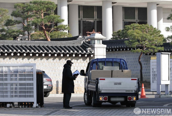 [서울=뉴스핌] 윤창빈 기자 = 21일 서울 종로구 청와대 시화문으로 화물차량이 들어서고 있다. 3년7개월만에 용신에서 청와대로 이전한 대통령실 집무실은 올해 말까지 이사를 마무리해 내년부터 본격 업무에 돌입할 예정이다. 2025.12.21 pangbin@newspim.com