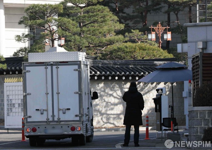 [서울=뉴스핌] 윤창빈 기자 = 21일 서울 종로구 청와대 시화문으로 화물차량이 들어서고 있다. 3년7개월만에 용신에서 청와대로 이전한 대통령실 집무실은 올해 말까지 이사를 마무리해 내년부터 본격 업무에 돌입할 예정이다. 2025.12.21 pangbin@newspim.com