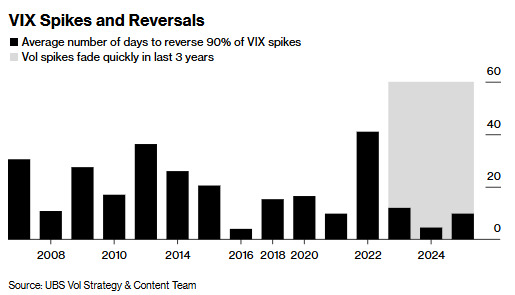 VIX 급등 후 회복 소요 기간 변화, VIX 급등 이후 상승폭의 90%가 되돌려지는 데 걸리는 연도별 평균 일수 [자료=블룸버그통신]