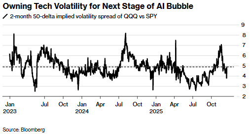 UBS 전략가들에게 AI 붐이 계속될지 아니면 붕괴할지에 대한 질문은 기술주 중심 나스닥 100 지수의 더 높은 변동성에서 이익을 얻는 계약을 소유하는 것을 거래의 양측면을 플레이하는 데 핵심으로 만든다. 스위스 은행의 미국 주식파생상품 리서치 책임자 맥스웰 그리나코프는 지수에 대한 변동성 베팅이 두 시나리오 모두에서 더 나은 성과를 낸다고 말하며, 거래가 스트래들이나 장외 스왑을 사용해 방향적으로 중립적으로 구조화될 수 있다고 덧붙였다.