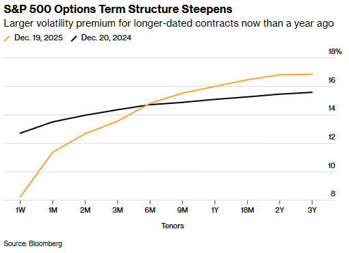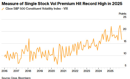 "2025년은 전반적으로 광범위한 위험선호 대 위험회피보다는 로테이션과 좁은 리더십의 해였다"고 UBS그룹의 파생상품 전략가 키어런 다이아몬드가 말했다. "이것은 내재 상관관계 수준을 기록적 저점으로 끌어내리는 데 도움이 됐고, 결과적으로 거시경제 동인이 다시 주도권을 잡을 때마다 VIX가 지속적으로 과도한 급등 위험에 처하게 만들었다."