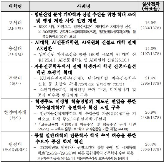 한양여대는 전공자율선택제와 '학교 밖 수업'(협동수업) 기준을 바탕으로 학생 주도 '자유설계학기'를 운영했다. 원광대는 원광대·원광보건대 통합 승인에 따른 규제특례(2025년 4월 21일~2029년 4월 20일)를 활용해 통합 일반대학에서 전문학사 수여를 가능케 한 사례로 국민심사 최다 득표를 받았다.