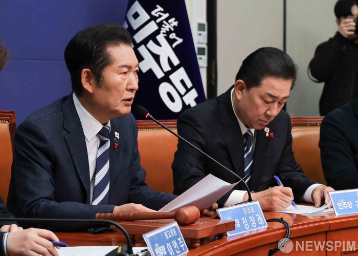 [서울=뉴스핌] 윤창빈 기자 = 정청래 더불어민주당 대표가 22일 서울 여의도 국회에서 열린 최고위원회의에서 모두발언을 하고 있다. 2025.12.22 pangbin@newspim.com