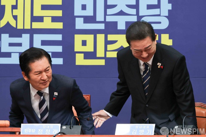 [서울=뉴스핌] 윤창빈 기자 = 정청래 더불어민주당 대표, 김병기 원내대표가 22일 서울 여의도 국회에서 열린 최고위원회의에 참석하고 있다. 2025.12.22 pangbin@newspim.com