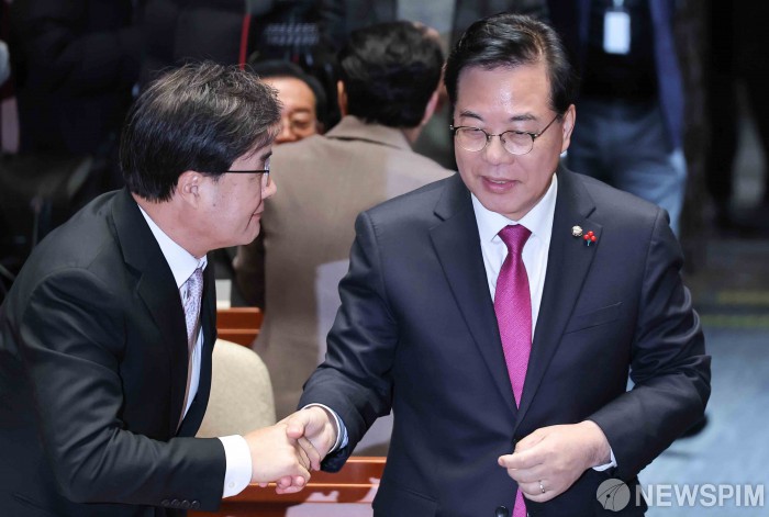 [서울=뉴스핌] 윤창빈 기자 = 송언석 국민의힘 원내대표가 22일 서울 여의도 국회에서 열린 의원총회에 참석하고 있다. 2025.12.22 pangbin@newspim.com