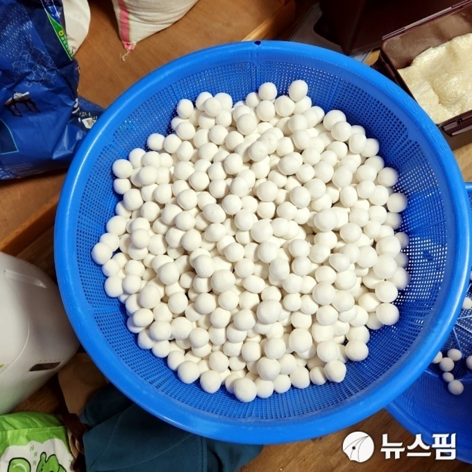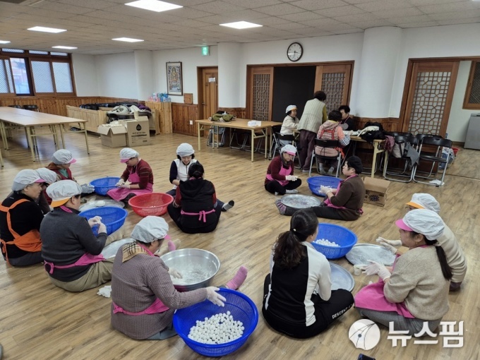 [울진=뉴스핌] 남효선 기자 = 동짓날 전날인 21일 경북 울진군 울진읍 소재 천태종 봉화사 신도회원들이 '동지 팥죽 공양'에 쓰일 '동지 팥죽'을 정성스레 빚고 있다. 2025.12.22 nulcheon@newspim.com