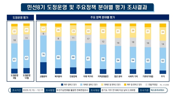 경기도가 여론조사 전문기관 넥스트리서치에 의뢰해 12월 실시한 여론조사 결과, 경기도정 운영을 '잘하고 있다'는 응답은 67%로 집계됐다고 22일 밝혔다. 이는 동일한 조사 설계로 실시한 9월 61%보다 6%p 상승한 수치다. 반면, 도정 운영을 '잘 못하고 있다'는 응답은 21%로 9월 22% 대비 1%p 하락했다.