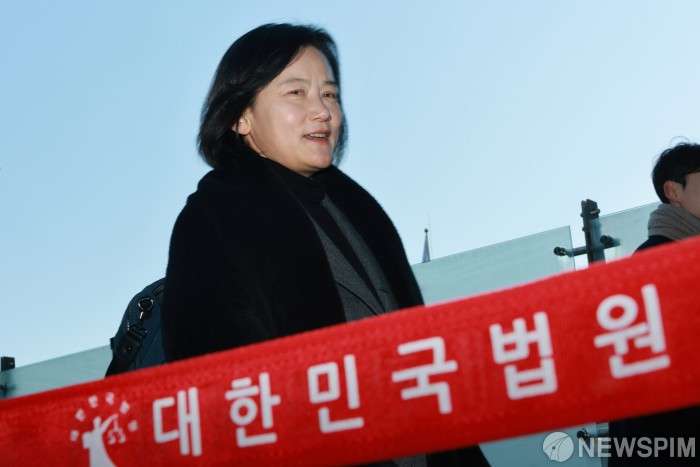 [서울=뉴스핌] 김학선 기자 = 최근 법무부 인사에서 고검 검사급 보직으로 사실상 강등된 정유미 검사장이 22일 오전 인사 효력을 멈춰달라며 낸 집행정지 신청 심문기일에 출석하기 위해 서울행정법원에 들어서고 있다. 2025.12.22 yooksa@newspim.com