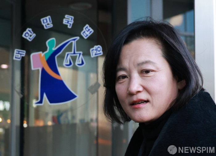 [서울=뉴스핌] 김학선 기자 = 최근 법무부 인사에서 고검 검사급 보직으로 사실상 강등된 정유미 검사장이 22일 오전 인사 효력을 멈춰달라며 낸 집행정지 신청 심문기일에 출석하기 위해 서울행정법원에 들어서고 있다. 2025.12.22 yooksa@newspim.com