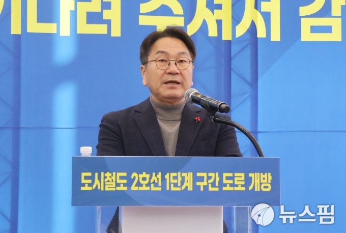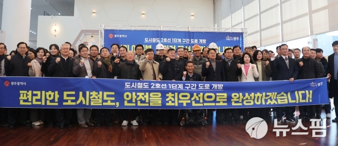 강 시장은 이날 청사 시민홀에서 도시철도 2호선 1단계 도로개방 추진 경과를 알렸다. 이날 행사는 광주시의원, 소상공인, 일반시민 등 120여명이 참석한 가운데 진행됐다.