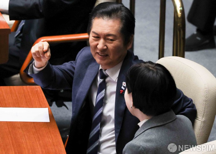 [서울=뉴스핌] 윤창빈 기자 = 정청래 더불어민주당 대표, 전현희 의원이 22일 서울 여의도 국회에서 열린 본회의에서 대화를 나누고 있다. 2025.12.22 pangbin@newspim.com