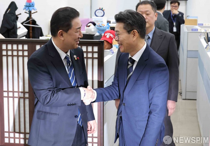 [서울=뉴스핌] 윤창빈 기자 = 정원오 서울시 성동구청장이 22일 서울 여의도 국회에서 김병기 더불어민주당 원내대표와 면담을 하기 위해 들어서며 인사를 나누고 있다. 2025.12.22 pangbin@newspim.com