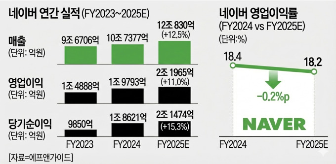 22일 증권정보업체 에프앤가이드에 따르면 네이버의 올해 연간 실적 컨센서스(증권사 전망치 평균)는 매출 12조830억 원, 영업이익 2조1,965억 원, 당기순이익 2조1,473억 원으로, 작년 실적 대비 매출과 영업이익, 당기순이익 모두 늘어날 것으로 예상된다. 올해 AI 기술과 자체 생태계 강화를 통해 매출과 이익이 꾸준히 증가한 가운데, 특히 커머스와 핀테크 사업 매출이 성장을 견인했다.