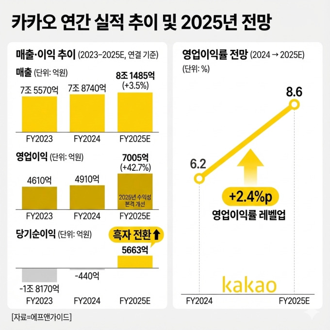 증권가는 네이버와 마찬가지로 카카오도 내년부터 AI 서비스를 통한 성과를 거둘 것으로 보고 있다. 에프앤가이드가 집계한 카카오의 2026년 연간 실적 컨센서스는 매출 8조9,367억 원, 영업이익 8,788억 원, 당기순이익 6,660억 원으로, 올해 전망치 대비 매출과 영업이익, 당기순이익 모두 성장이 예상된다.