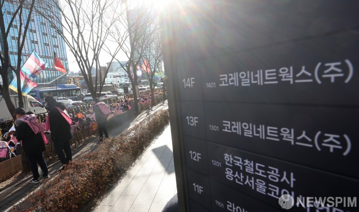 [서울=뉴스핌] 최지환 기자 = 22일 오후 서울 용산구 코레일네트웍스 사무실 앞에서 철도노조 소속 조합원들이 코레일네트웍스지부 총파업 결의대회를 열고 있다. 2025.12.22 choipix16@newspim.com