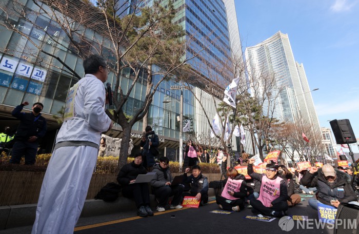 [서울=뉴스핌] 최지환 기자 = 22일 오후 서울 용산구 코레일네트웍스 사무실 앞에서 철도노조 소속 조합원들이 코레일네트웍스지부 총파업 결의대회를 열고 있다. 2025.12.22 choipix16@newspim.com