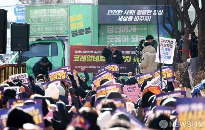 [서울=뉴스핌] 최지환 기자 = 22일 오후 서울 용산구 코레일네트웍스 사무실 앞에서 열린 코레일네트웍스지부 총파업 결의대회에서 참가자들이 구호를 외치고 있다. 2025.12.22 choipix16@newspim.com
