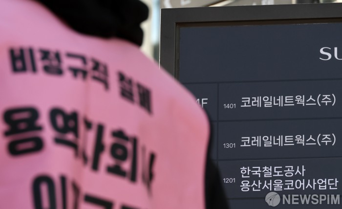 [서울=뉴스핌] 최지환 기자 = 22일 오후 서울 용산구 코레일네트웍스 사무실 앞에서 철도노조 소속 조합원들이 코레일네트웍스지부 총파업 결의대회를 열고 있다. 2025.12.22 choipix16@newspim.com
