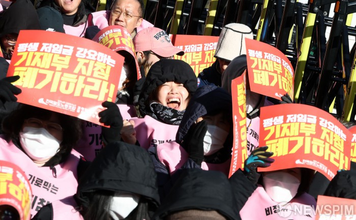 [서울=뉴스핌] 최지환 기자 = 22일 오후 서울 용산구 코레일네트웍스 사무실 앞에서 열린 코레일네트웍스지부 총파업 결의대회에서 참가자들이 구호를 외치고 있다. 2025.12.22 choipix16@newspim.com