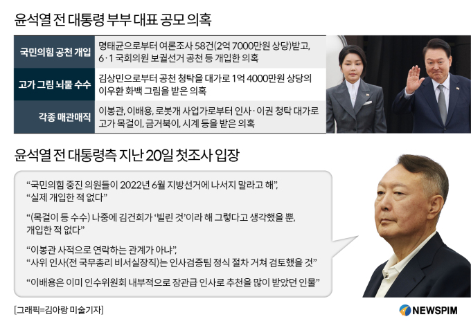 윤 전 대통령은 우선 2022년 3월경 전까지 김 여사와 공모해 명태균 씨로부터 2억 7000만원 상당 여론조사를 무상으로 수수한 의혹을 받는다.