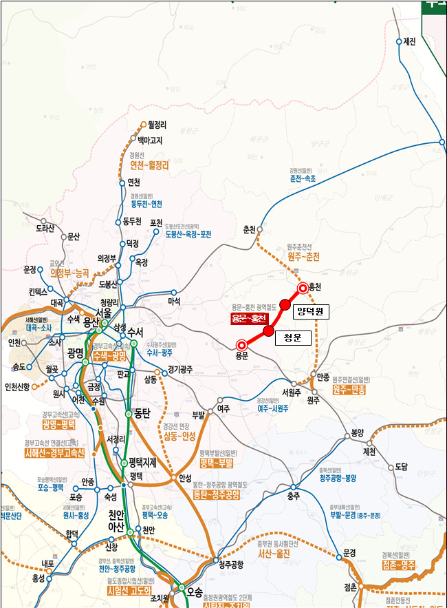 용문~홍천 철도는 경기 양평군 용문역에서 강원 홍천군까지 32.7㎞ 구간에 단선 광역철도를 신설하는 사업으로, 총사업비는 1조 995억 원 규모다.