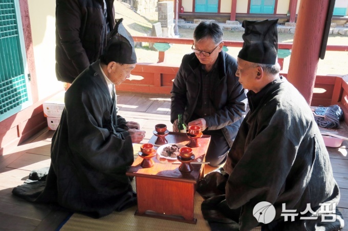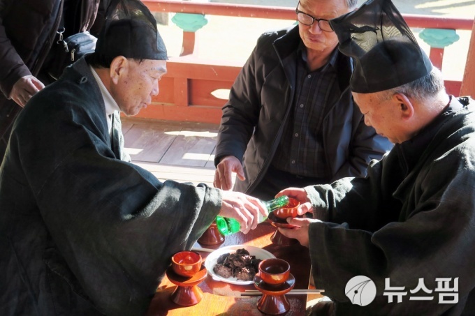 이날 담양 전씨 문중은 파임 회의를 통해 선임된 신임 제장과 지나간 한 해의 춘추 향사 등 조상 의례를 총괄해 온 제장은 재실인 양정재의 마루에서 '팥경단과 제주'를 차린 상을 마주하고 앉아 제장의 책임과 역할을 인수인계하는 음복례를 치렀다.