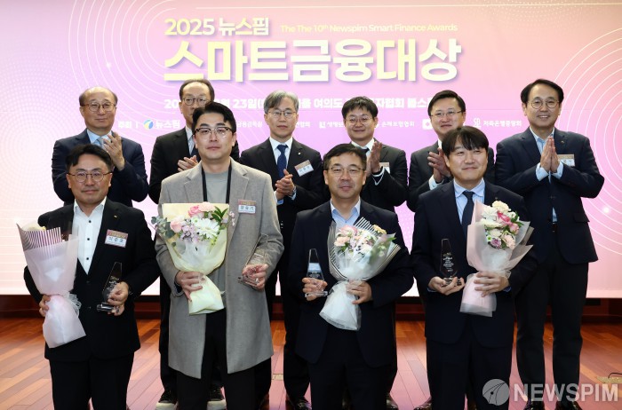 [서울=뉴스핌] 최지환 기자 = 23일 오전 서울 영등포구 금융투자협회에서 뉴스핌 주최로 열린 2025 뉴스핌 스마트금융대상에서 유근석 뉴스핌 대포를 비롯한 참가자들이 기념촬영을 하고 있다. 왼쪽 윗줄부터 시계방향으로 유근석 대표, 김경민 전국은행연합회 본부장, 이종오 금융감독원 부원장보, 임병화 성균관대 교수, 최종수 손해보험협회 본부장, 조윤서 여신금융협회 본부장, 김준식 신한카드 본부장, 임재필 DB손해보험 파트장, 양승기 삼성화재 파트장, 이준호 KB국민은행 상무. 2025.12.23 choipix16@newspim.com