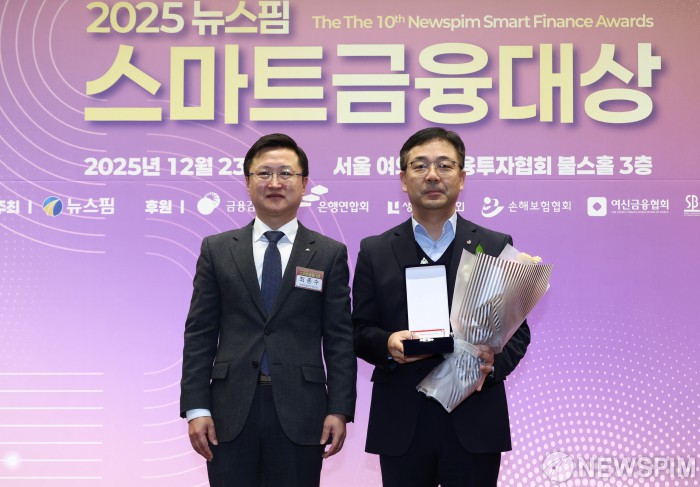 [서울=뉴스핌] 최지환 기자 = 최종수 손해보험협회 본부장이 23일 오전 서울 영등포구 금융투자협회에서 뉴스핌 주최로 열린 2025 뉴스핌 스마트금융대상에서 임재필 DB손해보험 보상기획파트장에게 디지털 혁신 리더상을 시상한 후 함께 기념촬영을 하고 있다. 2025.12.23 choipix16@newspim.com