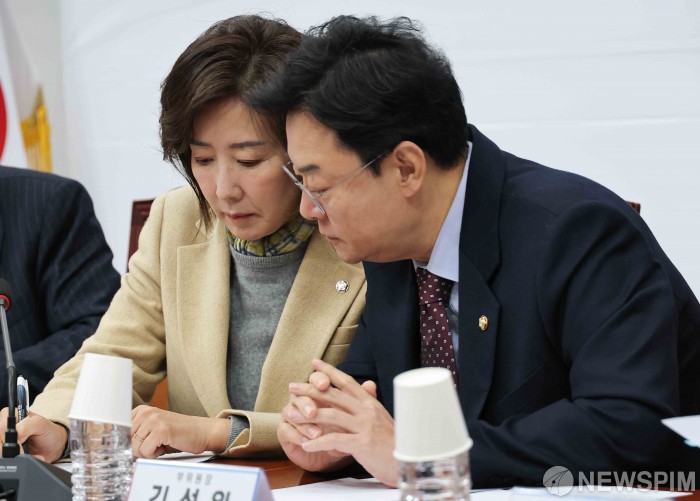[서울=뉴스핌] 윤창빈 기자 = 나경원 국민의힘 지방선거총괄기획단 위원장, 김성원 부위원장이 23일 서울 여의도 국회에서 열린 지방선거총괄기획단 전체회의에서 대화를 나누고 있다. 2025.12.23 pangbin@newspim.com