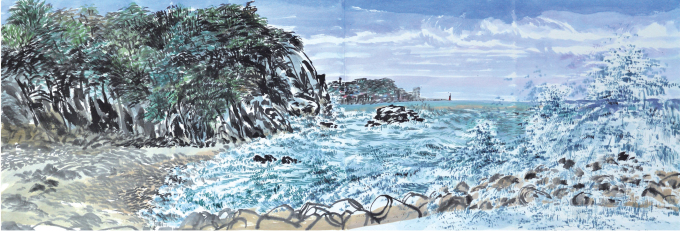 작품 세계는 전통 수묵화의 정신성을 바탕으로 하면서도 현대적 공간 구성과 색채 실험을 결합해 자연과 인간, 인공 구조물과 바다 풍경이 한 화면 안에서 공존하는 장면을 만들어낸다. 거친 파도와 고요한 수면, 방파제와 건물, 절벽과 마을 등이 겹겹이 배치되며 동해가 품고 있는 시간의 축적과 기억, 그리고 도시와 바다가 공존하는 지역의 정체성을 시각적으로 드러낸다.