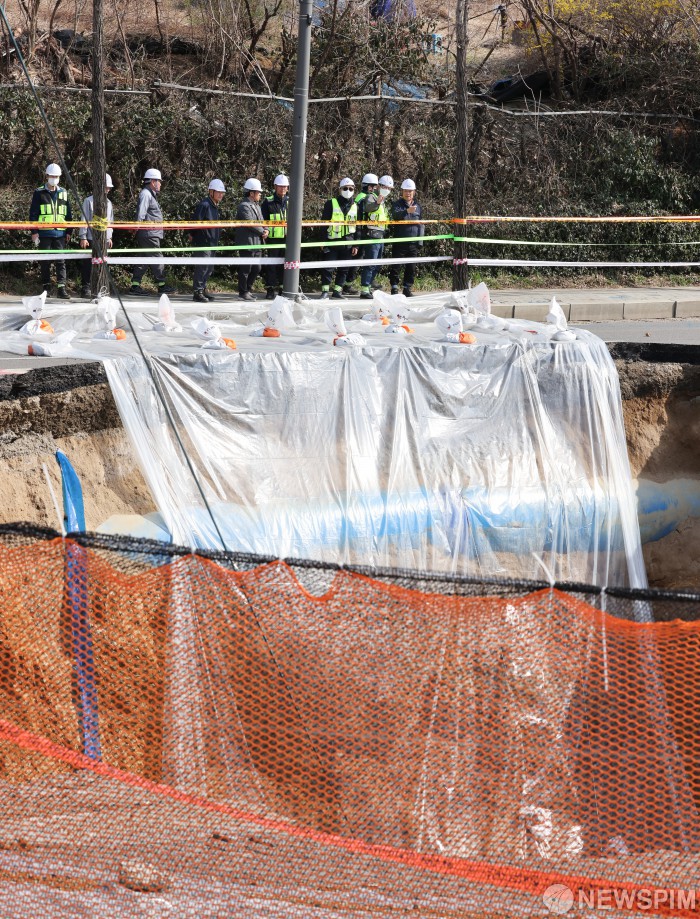 지난 3월 발생한 서울 강동구 명일동 대형 땅꺼짐(싱크홀) 사고 현장에서 중앙지하사고조사위원회(사조위) 위원들이 현장을 조사하고 있다. [사진=뉴스핌DB]