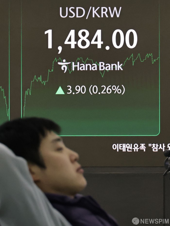 [서울=뉴스핌] 양윤모 기자 = 23일 오후 서울 외환시장에서 달러/원 환율이 전장 대비 3.90원 오른 1484.00원을 기록한 가운데, 서울 중구 하나은행 딜링룸에서 직원들이 업무를 보고 있다. 달러/원 환율 1484원은 지난 4월9일(1487.6원) 이후 8개월여 만에 가장 높은 기록이다. 2025.12.23 yym58@newspim.com